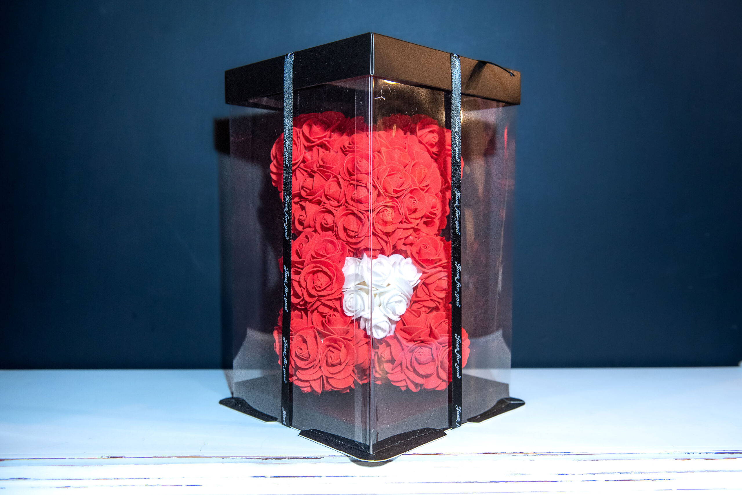 Orsetto con rose rosse in caucciù e cuore con rose bianche in confezione trasparente.